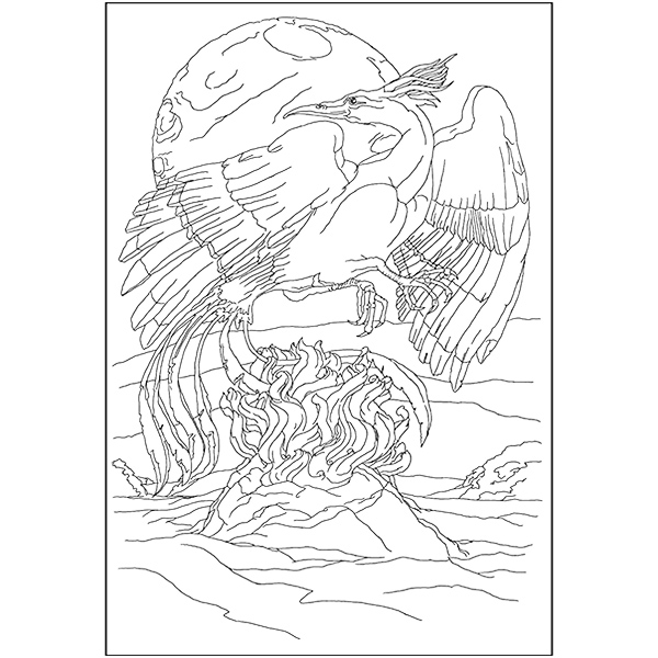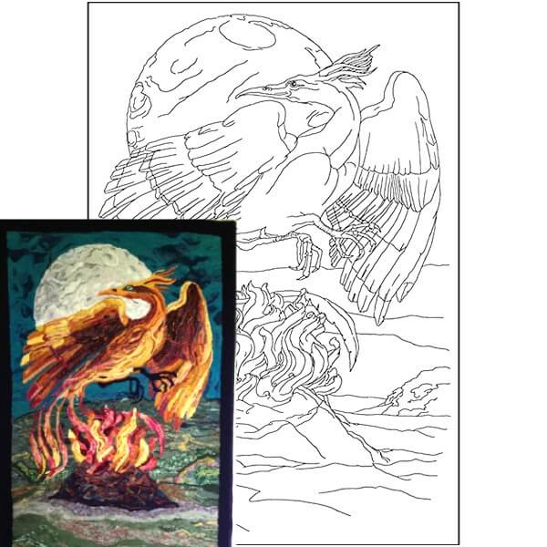 This Pattern depicts a phoenix being reborn and rising from the firey ashes of its predecessor. Features a large moon in the background.