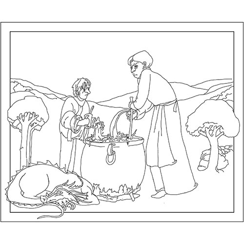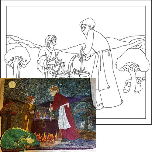 In this fantastical pattern, a fabric dyer and his apprentice work outside over a hot cauldron as the pet dragon snoozes by the fire. Wouldn’t this be a fun addition to a child’s room?